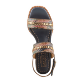 - Metallic gold leather whipstitch accents complimented on the embossed hand-painted leather upper