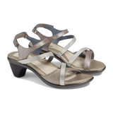 Naot Innovate Heeled Sandal (Women) - Silver Threads Leather/Beige/Clear Rhinestones