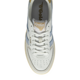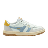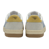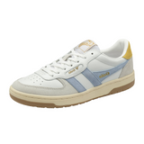 Introducing the latest addition to the luxurious Gola Classics collection - Hawk, inspired by court sports. This sophisticated sneaker silhouette for women features a blend of leather, suede, and mesh in a pristine white/air/pollen and delicate light grey. Completed with a two-tone cup sole, this understated design exudes a laid-back '80s aesthetic. Perfectly pairs with loose denim or a chic midi skirt.