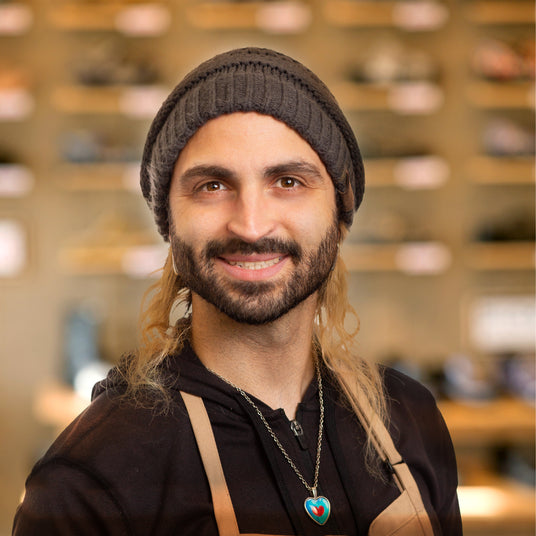 Meet our Cobbler, Justin, a dedicated member of The Heel family for 8 years. With a passion for tall leather boots, Justin thrives in the repair shop, finding joy in the variety of tasks each day brings. He cherishes the close-knit camaraderie with coworkers, considering them more like family. Outside of work, Justin is an avid Pokemon card collector and enjoys crafting unique outfits for Cosplay.